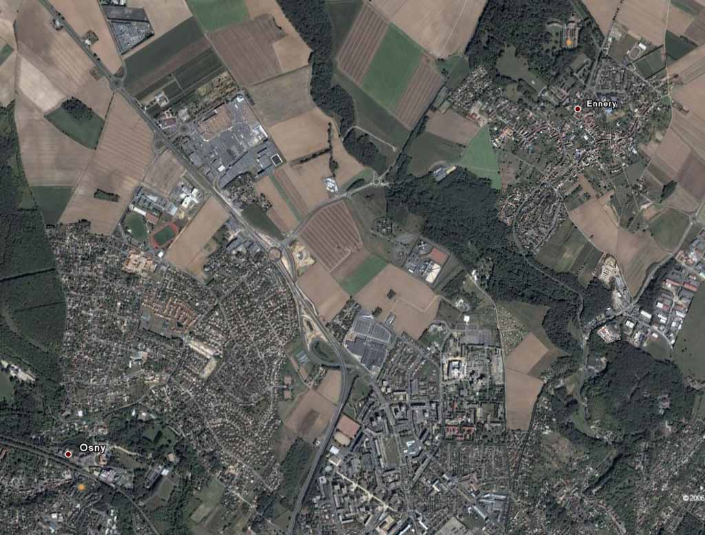 | Par rapport à Osny en bas à gauche, le point orange chez JP et AM | et le point orange, en haut à droite, le pavillon de Papy |