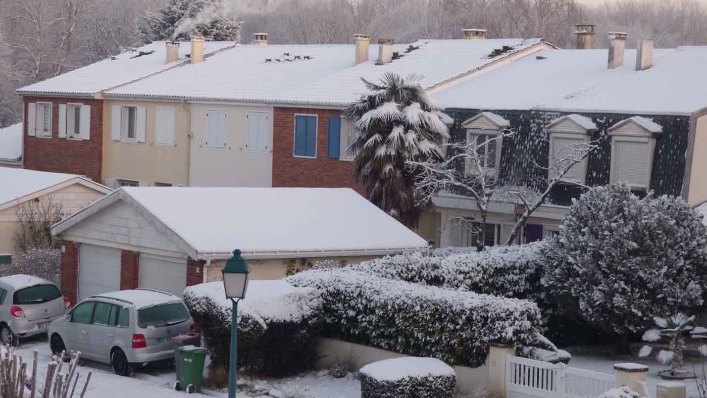 La neige sur un palmier, c'est amusant et tellement rare. Photo prise de la fenêtre de la chambre