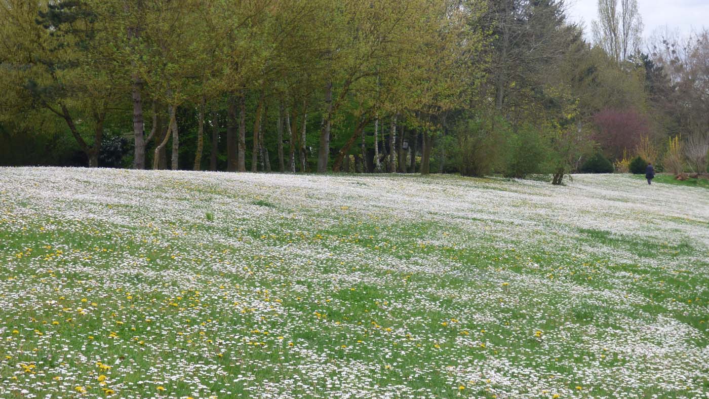 | © Ph.Hillion photo prise le 15 avril 2018 | au premier jour des vacances de Pâques, les paquerettes près de la maison s'en donnent à coeur-joie |