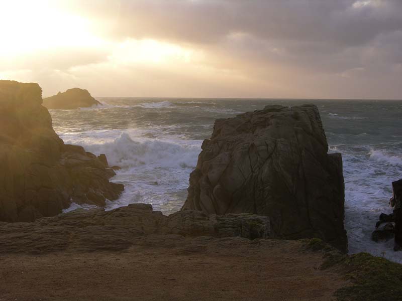 | © Ph.Hillion photo prise le 3 janvier 2007 | Le soleil va disparaître quasiment derrière La Truie et les vagues s'engoufrent dans les criques de Port Bara |